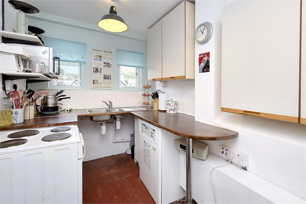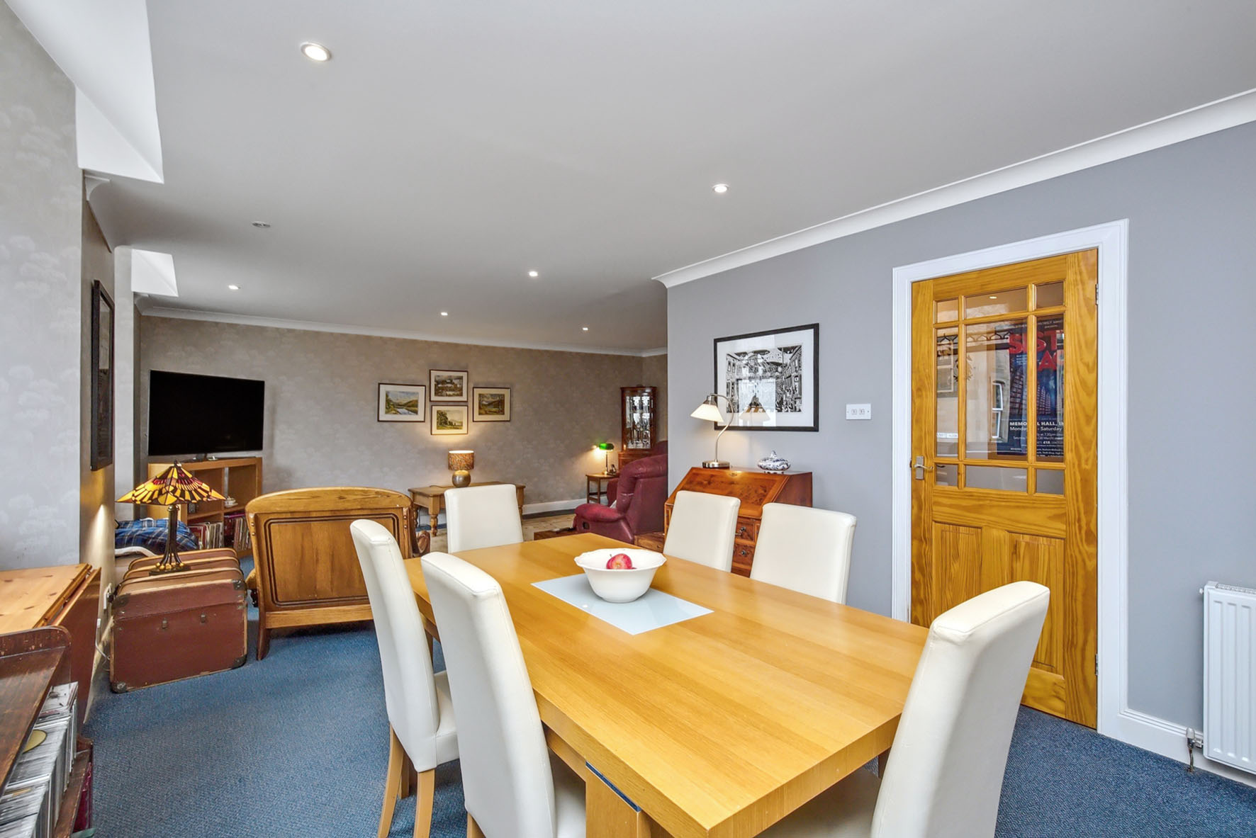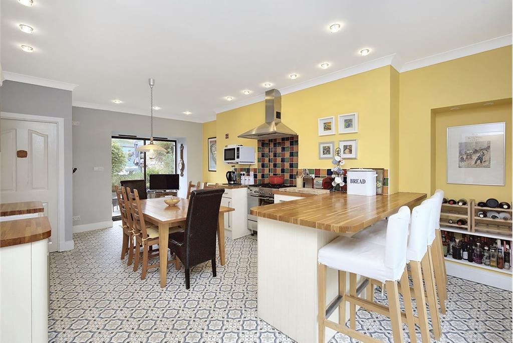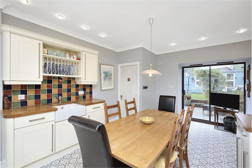 The front door opens into a welcoming hallway, leading directly into the kitchen on the right. Here, a selection of attractive, cream-coloured cabinets is accompanied by spacious wood worktops, splashback tiling, and a Belfast sink. A Range cooker is neatly housed within the cabinets and paired with an integrated extractor hood, with space provided for freestanding and undercounter appliances. A breakfast bar caters for morning coffee and socialising while cooking, whilst provision is made for a dining table and chairs for sit-down meals and entertaining. Patio doors from here open out onto the garden.